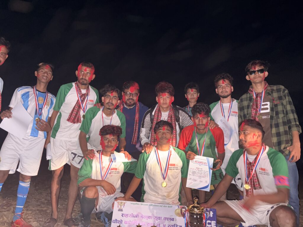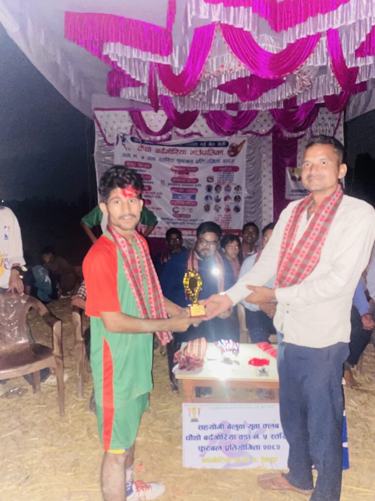 कैलालीको बर्दगोरिया गाउपालिका –५ बेलुवामा सम्पन्न चौथो बर्दगोरिया गा. पा वडा नम्बर ५ वडा स्तरीय फूटबल प्रतियोगिता को उपाधि प्रभु महलक्ष्मी लाईफ इन्सुरेन्सले हात पारेको छ । बुधबार भएको फाइनल खेलमा प्रभु महालक्ष्मी लाईफ इन्सुरेन्सले जिन्जी लाई ३–० गोल अन्तरले पराजित गर्दै उपाधि आफ्नो पक्षमा पारेको हो ।