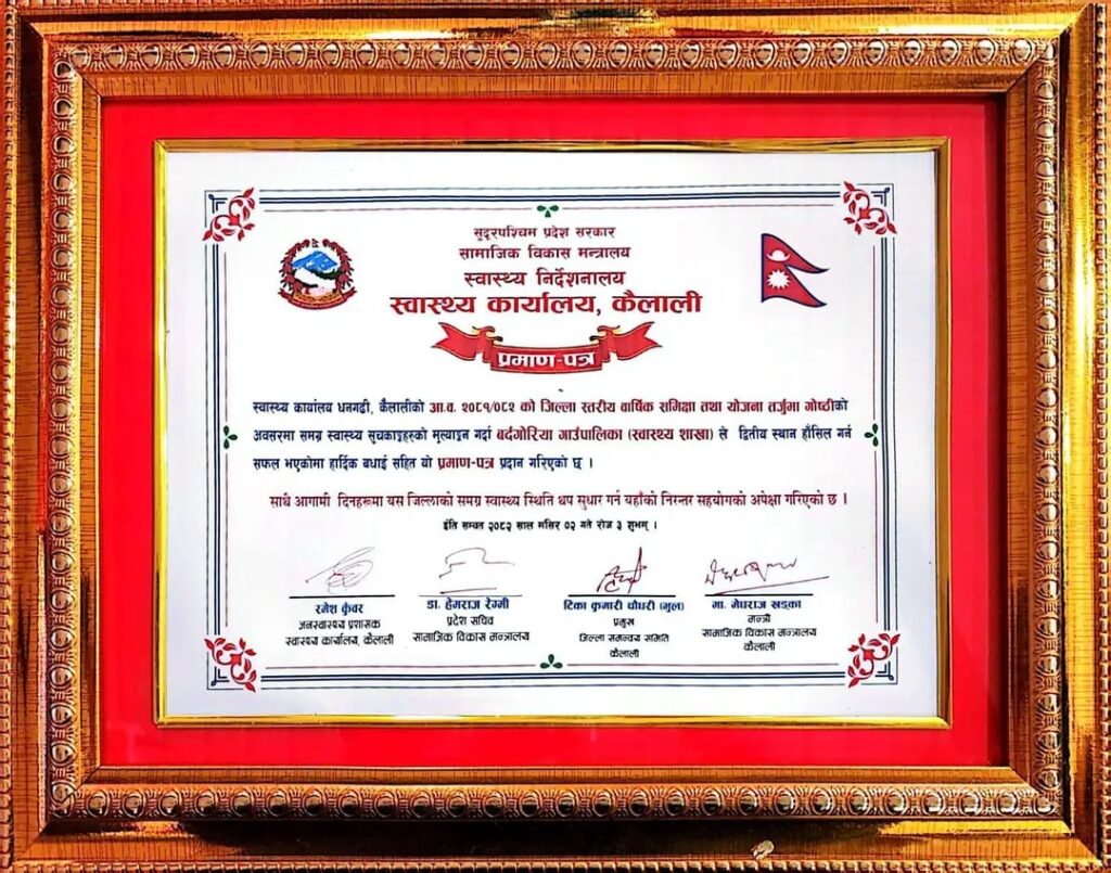 धनगढी, कैलाली —स्वास्थ्य कार्यालय धनगढी, कैलालीको आयोजनामा सम्पन्न जिल्लास्तरिय वार्षिक स्वास्थ्य समीक्षा गोष्ठी–२०८२ मा बर्दगोरिया गाउँपालिकाले उत्कृष्ट प्रदर्शन गर्दै जिल्लाभर रहेका १३ स्थानीय तहमध्ये दोस्रो स्थान हासिल गर्न सफल भएको छ।