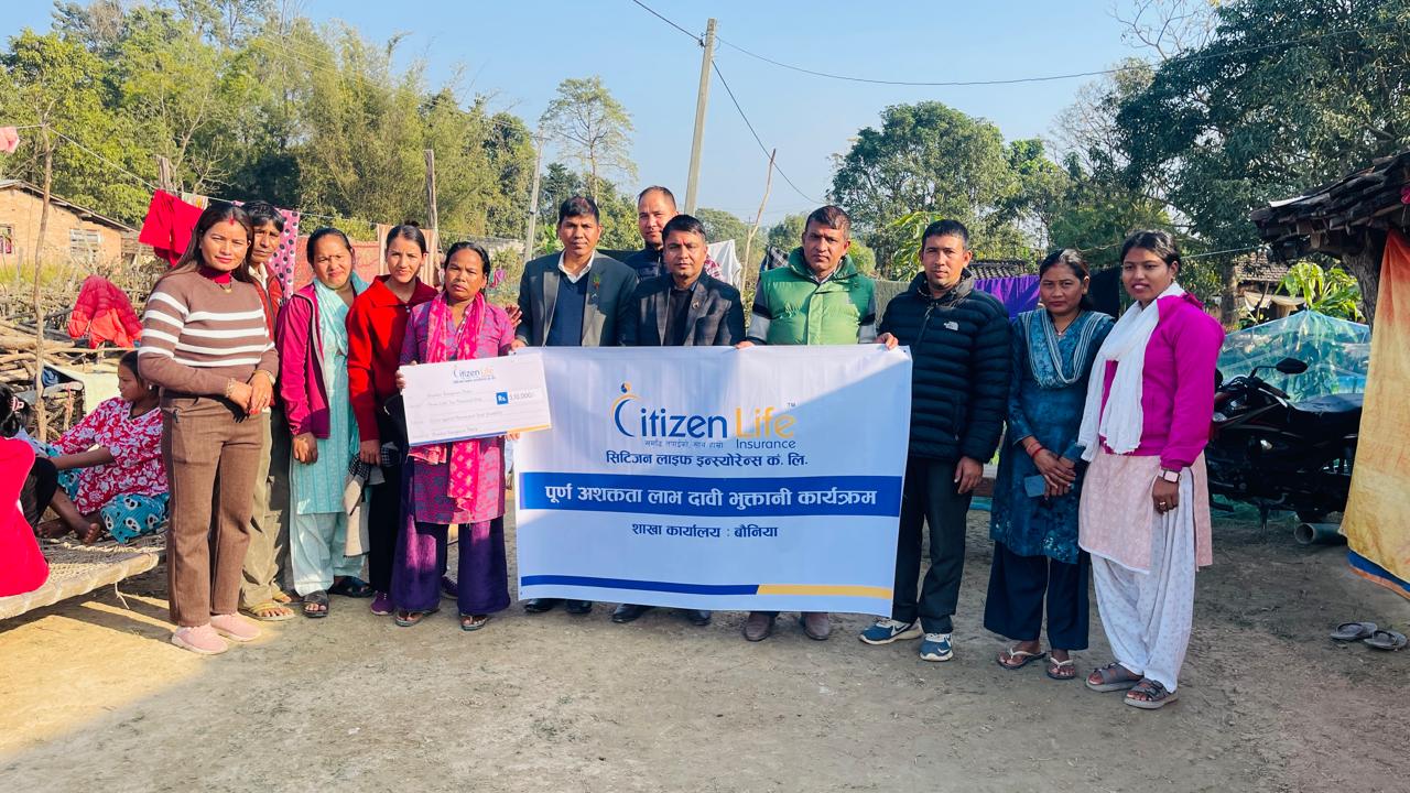सिटिजन लाईफ इन्स्योरेन्स कम्पनी लिमिटेड बौनिया शाखा द्धारा घोडाघोडी नगरपालिका वडा न ३ बस्ने शंकर डगौरा थारुकी आमा राज देवी डगौरा थारुलाई घरमै पुगी रु ३,१०,०००/- बराबर पूर्ण अशक्तता लाभ दाबी भुक्तानी प्रदान गरेको छ।