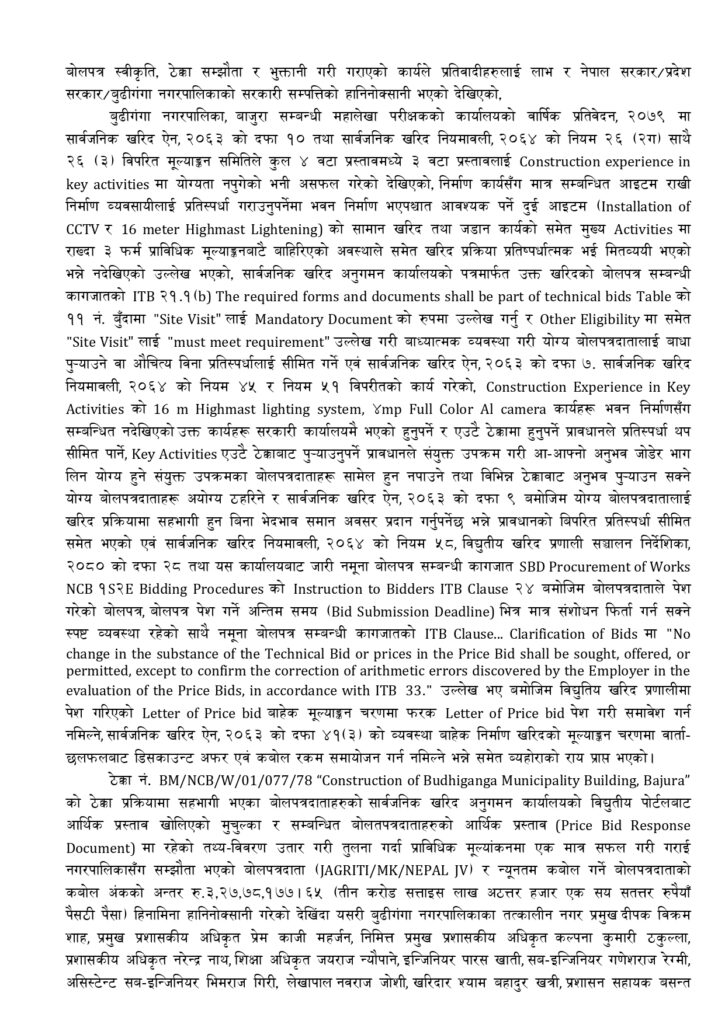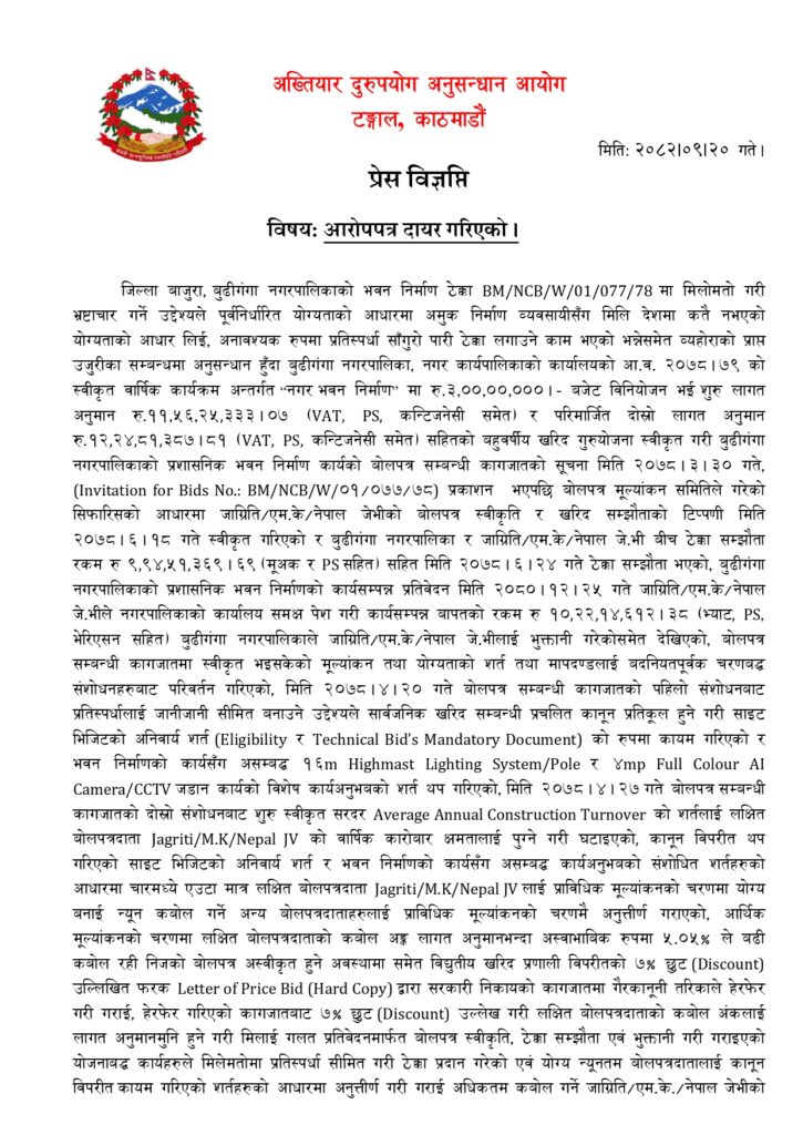 अख्तियार दुरुपयोग अनुसन्धान आयोगका अनुसार ठेक्का प्रक्रियामा सुरुदेखि नै मिलेमतो गरिएको पाइएको छ । प्रचलित कानुनविपरीत लक्षित बोलपत्रदातालाई ठेक्का दिन योग्यता शर्त तथा मापदण्ड बदनियतपूर्वक परिवर्तन गरिएको र बढी कबोल गर्ने बोलपत्रदातालाई स्वीकृत गरेर नगरपालिकालाई ठूलो आर्थिक हानी नोक्सानी पुर्याइएको आयोगको ठहर छ ।