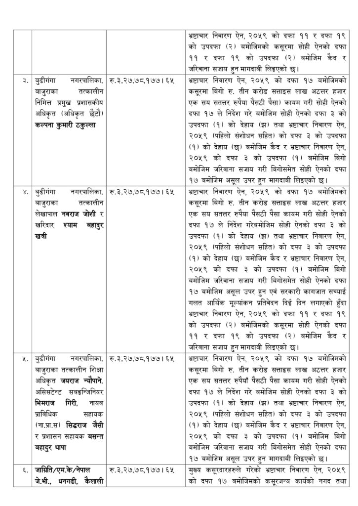 उनीहरूमाथि भ्रष्टाचार निवारण ऐन, २०५९ को दफा १७ बमोजिम सजाय मागदाबी गर्दै विशेष अदालत, काठमाडौंमा आरोपपत्र दायर गरिएको अख्तियारले जनाएको छ ।