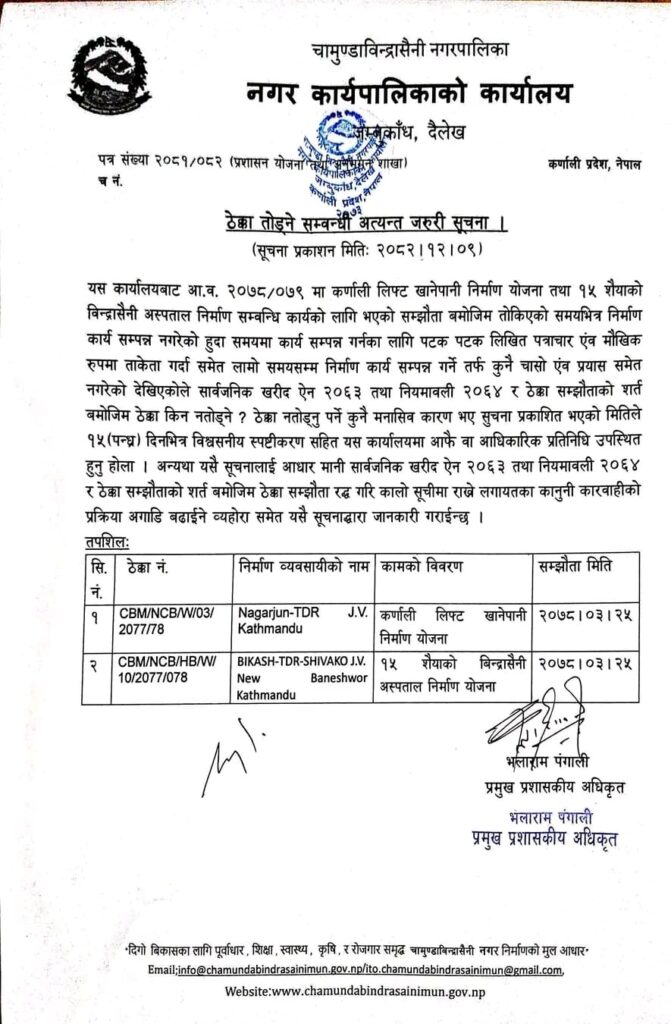 नगरपालिकाले ठेक्का नतोडिनुपर्ने कुनै मनासिब कारण भएमा १५ दिनभित्र विश्वसनीय स्पष्टीकरणसहित कार्यालयमा उपस्थित हुन आग्रह गरेको छ। अन्यथा सार्वजनिक खरिद ऐन, २०६३ तथा नियमावली, २०६४ र ठेक्का सम्झौताका सर्त अनुसार ठेक्का सम्झौता रद्द गरी कालोसूचीमा राख्ने लगायत थप कानुनी कारबाही अघि बढाइने चेतावनी दिएको छ।
