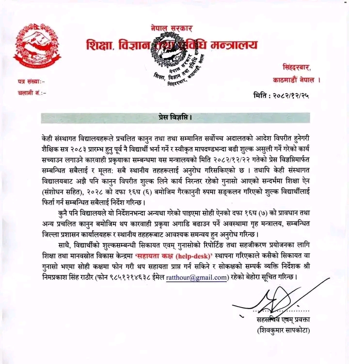 मन्त्रालयले बिहीबार जारी गरेको प्रेस विज्ञप्तिमा शैक्षिक सत्र २०८२ सुरु हुनुअघि नै विद्यार्थी भर्ना गर्दा स्वीकृत मापदण्डभन्दा बढी शुल्क असुलिएको गुनासो आएको उल्लेख गरिएको छ। यसअघि नै सम्बन्धित सबै निकाय तथा स्थानीय तहलाई यस्तो कार्य रोक्न अनुरोध गरिए पनि केही विद्यालयले अझै पनि अवैध रूपमा शुल्क लिने कार्य जारी राखेको मन्त्रालयको भनाइ छ।