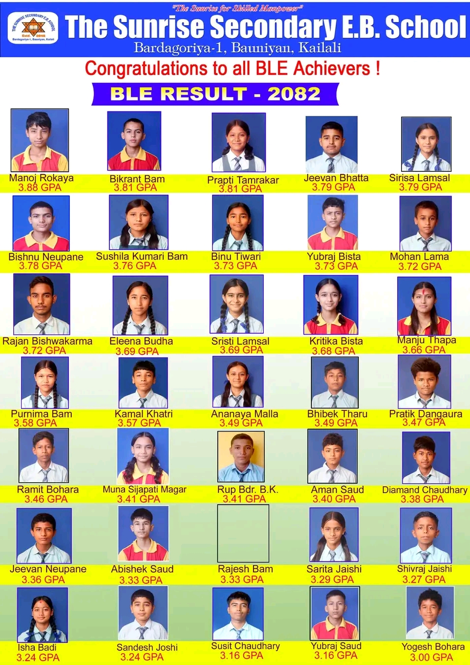 विद्यालयका अनुसार मनोज रोकाया (3.88 GPA) ले सर्वाधिक GPA ल्याएका छन्। त्यसैगरी विक्रान्त बम र प्राप्ति ताम्राकारले 3.81 GPA, जीवन भट्टा